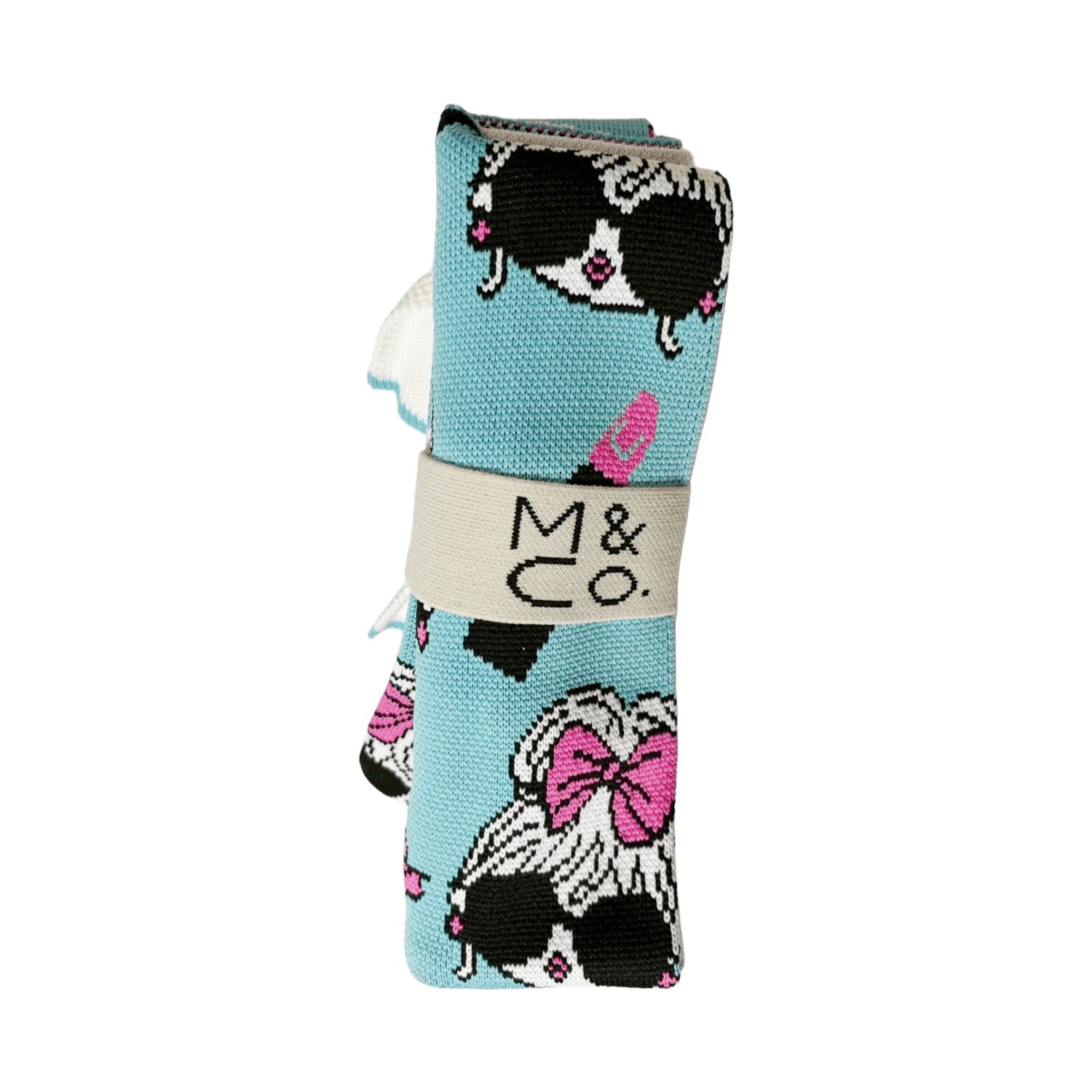 スタイリッシュさと機能性を兼ね備えたニットバッグ フリンジ表裏柄違い リボンガール ブルー