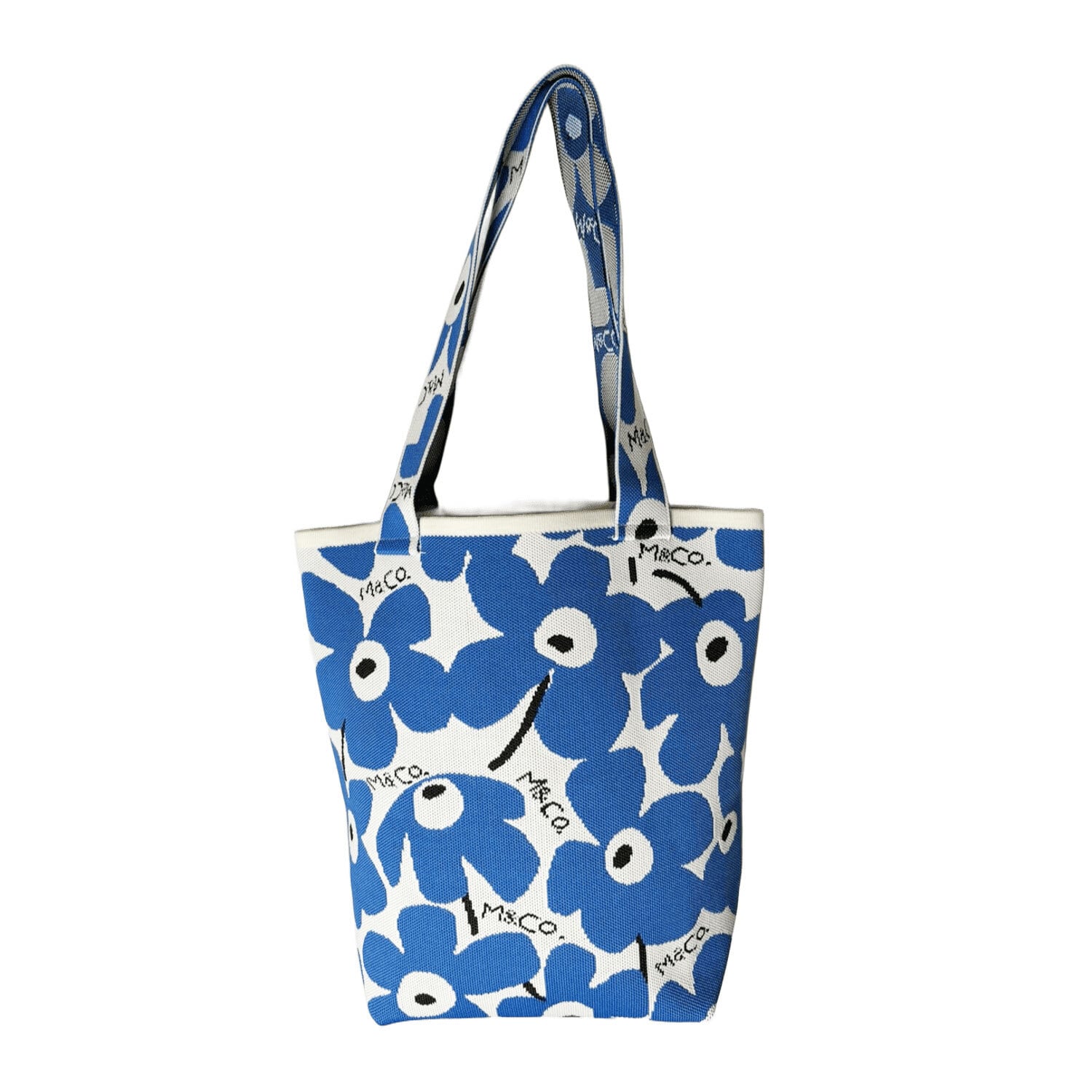 スタイリッシュさと機能性を兼ね備えたニットトート フラワー ブルー